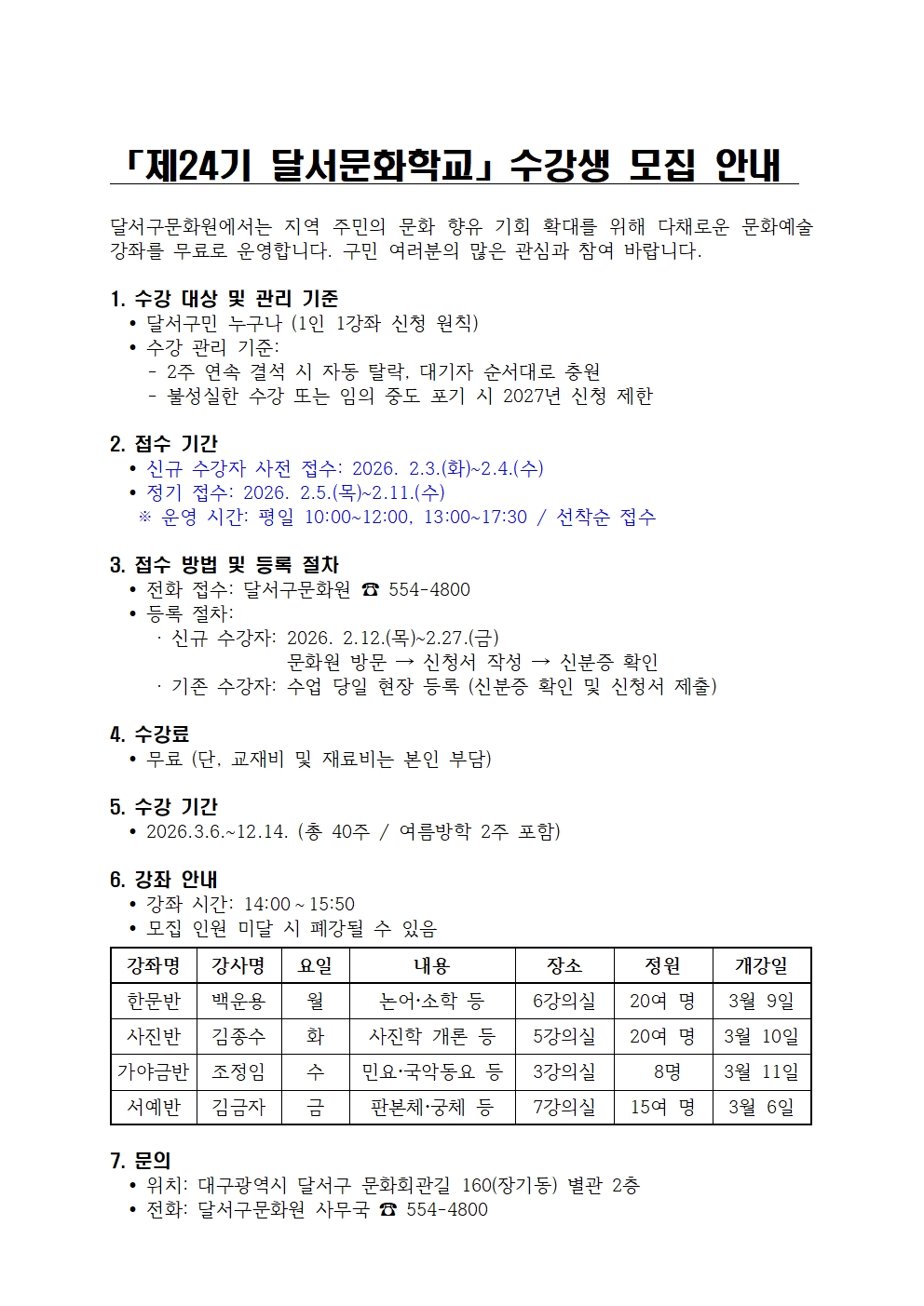 2026 「제24기 달서문화학교」 수강생 모집 안내